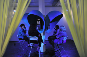 Viewers are led in small groups through a choreographed series of set pieces situated within immersive environments. These experiential and participatory works directly seek to engage with the viewer, or now participant, through sets of provoking questions that demand a response. Often nonsensical questions are posed and the unstable delivery from the automated voices reveals sinister undertones that allude to the power of the institutional hierarchy in the marketplace.